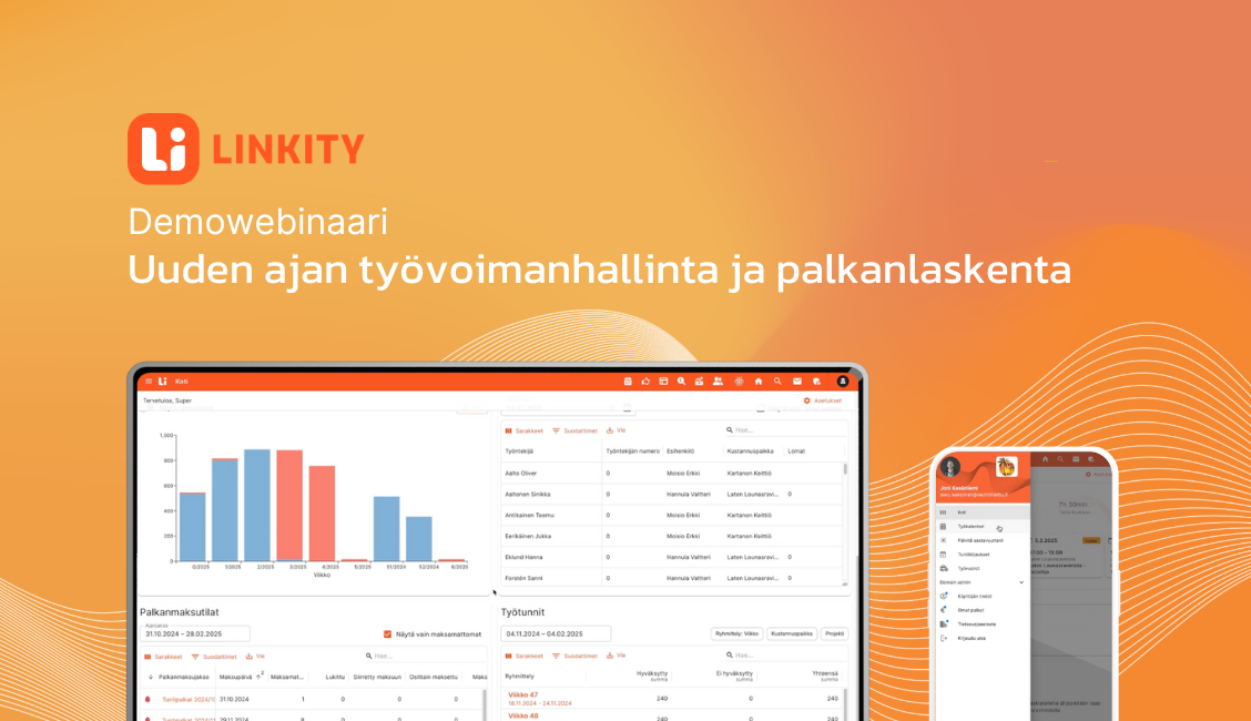 Tässä webinaarissa esittelemme Linkityn palveluita ja perehdymme ohjelmistoon lyhyen demon muodossa. Näet konkreettisesti kuinka Linkity virtaviivaistaa työvoimanhallinnan ja palkkaratkaisut yhdeksi soljuvaksi prosessiksi.